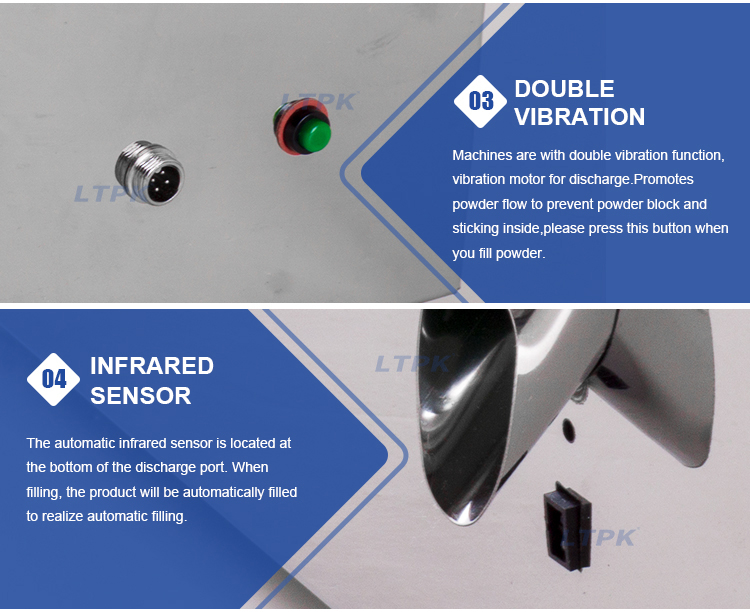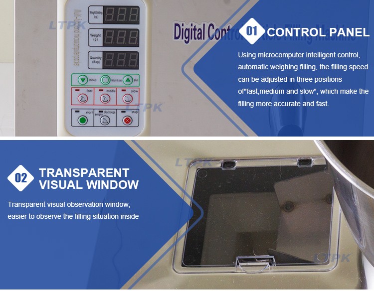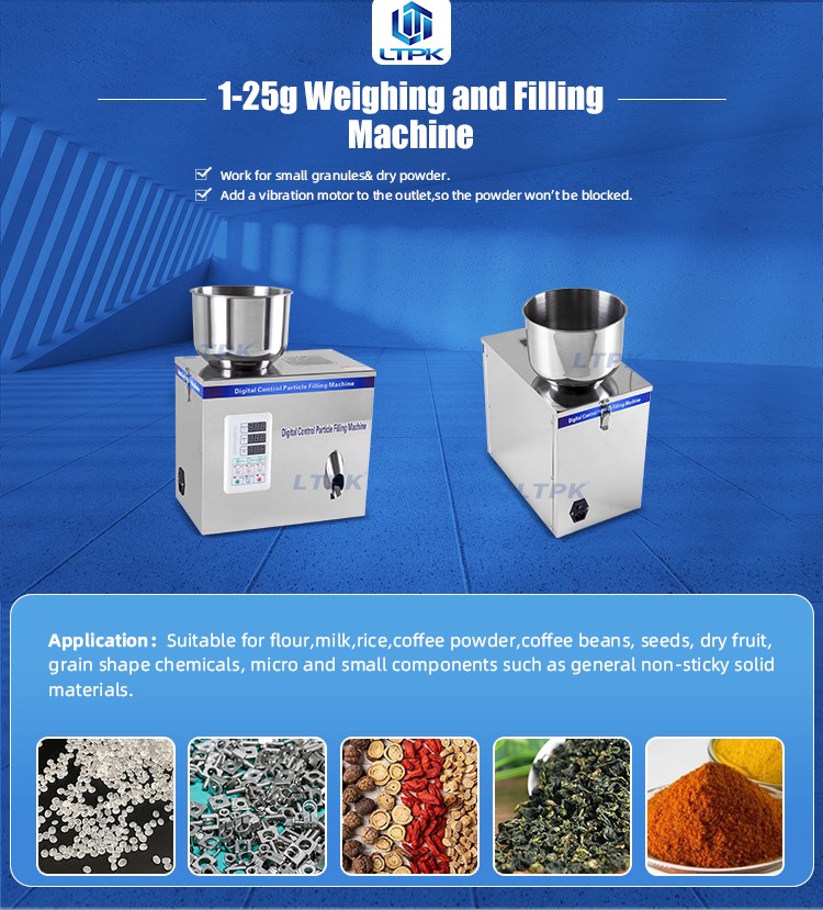 Suitable for precise filling of various non-viscous solid materials such as flour, milk powder, rice, coffee powder, coffee beans, seeds, dried fruits, granular chemicals and pharmaceuticals. The filling accuracy for 20g flour can reach ±0.2g, meeting the packaging needs of small-dose materials.