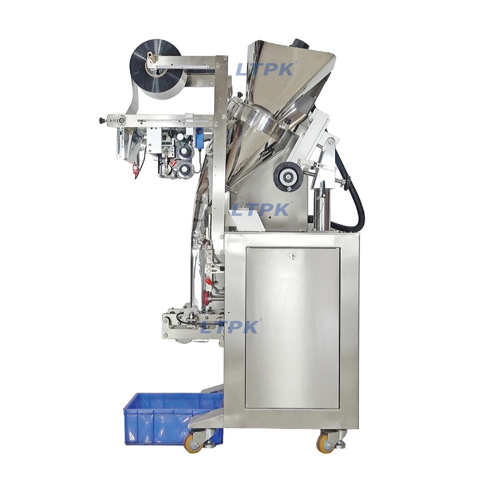 The LT-YS61AF automatic powder packaging machine features PLC & touch screen control, PID temperature control (±1℃ error), and stepper motor for precise bag length. It fully automates bag making, filling, sealing, cutting and counting, supporting 3-side sealing (optional back/4-side sealing). Ideal for food, chemical and cosmetic powders like milk powder, seasoning, etc.