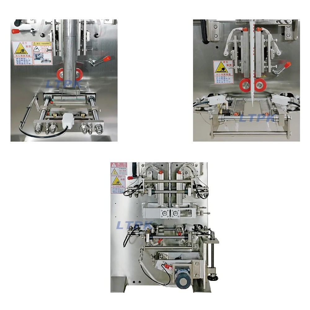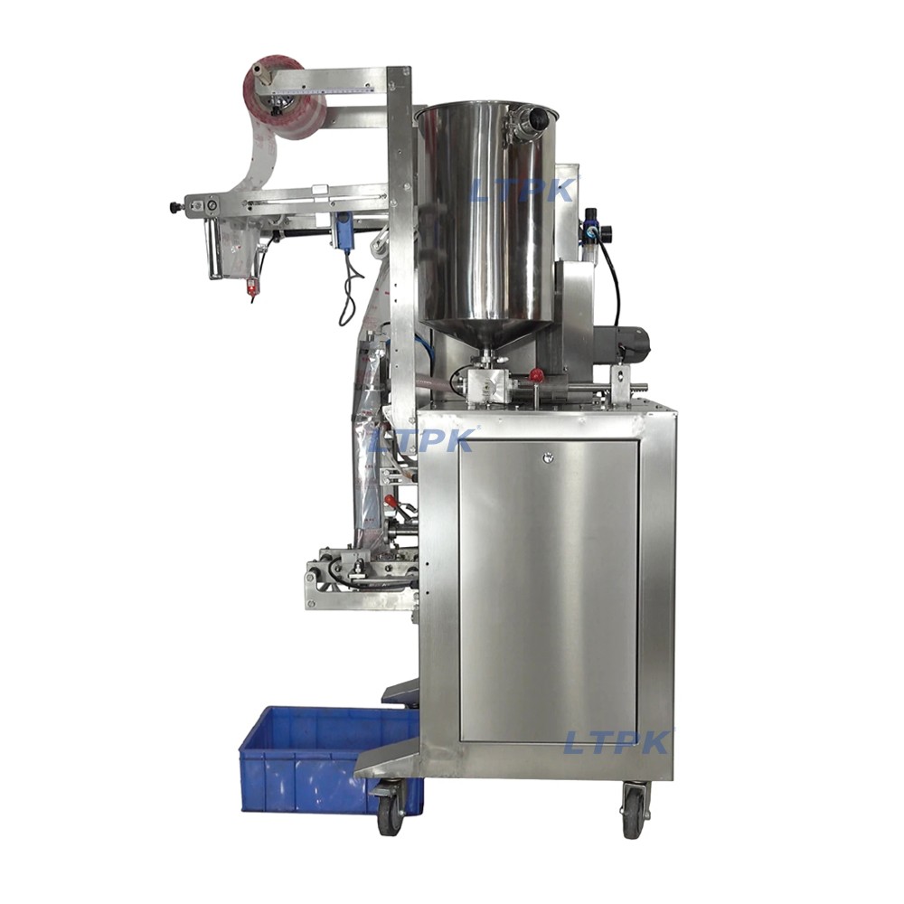 LT-YS61AF automatic packaging machine for liquid, sauce and granule products. PLC + touch screen control, PID temperature control (error ≤1°C), stepper motor driven. Fully automatic process (filling, sealing, cutting) with 3-side sealing option. Custom batch printing available for food, chemical and cosmetic applications.